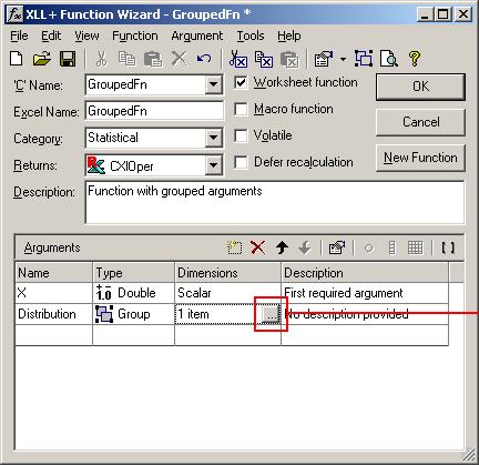 Use the XLL+ Function Wizard to add a new function, GroupedFn, filling in the function's details as shown below: