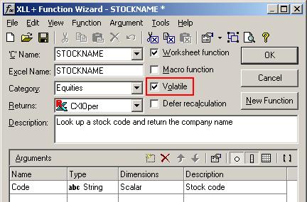 By marking the function as volatile, we are instructing Excel to recalculate the formula every time the worksheet containing it is recalculated. Because STOCKNAME depends on data that is outside Excel's control (in this case, the in-memory database), we must always assume that this external data has changed since we last called the function, and recalculate the function.