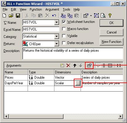 Use the XLL+ Function Wizard tool to launch the Function Wizard. As before, make sure HISTVOL is selected.