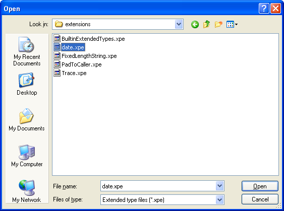 3. Navigate to the "extensions" sub-directory of the XLL+ installation directory (e.g. C:\Program Files\Planatech\XllPlus\6.0\VS8.0\extensions), select date.xpe and press the Open button.