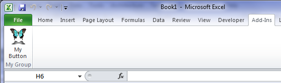 <?xml version="1.0" encoding="UTF-8"?> <customUI xmlns="http://schemas.microsoft.com/office/2006/01/customui"> <ribbon> <tabs> <!-- This tab element adds its child groups to the "Add-Ins" tab. --> <!-- To create a new tab element specify the id and label attributes, --> <!-- and remove the idMso attribute. --> <tab idMso="TabAddIns"> <!-- This group element creates a new region on the tab specified --> <!-- by its parent element. --> <group id="MyAddin_Group" label="My Group" getVisible="GetVisible"> <!-- This large button displays an image from the resources, --> <!-- whose ID is "LOGO", and a fixed label. When the button is --> <!-- pressed, the application class event handler function --> <!-- OnRibbonEvent() is called. --> <button id="MyAddin_PushButton" size="large" image="LOGO" label="My Button" onAction="OnActionButton" /> </group> </tab> </tabs> </ribbon> </customUI>