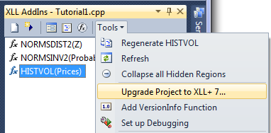 In the XLL Add-ins window, click on the Upgrade Project to XLL+ 7... command, located on the Tools menu.